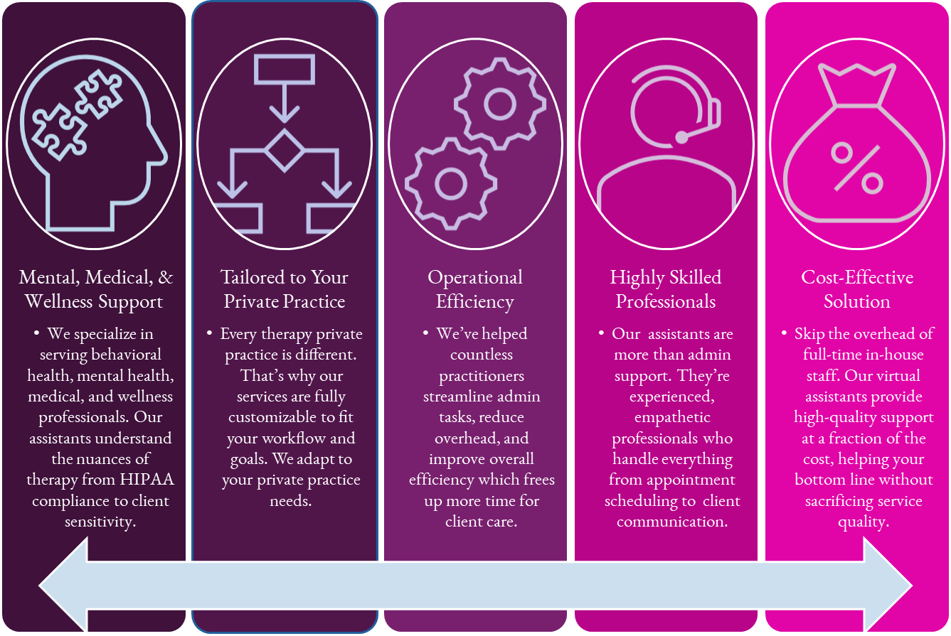 Relinquish the Administrative Burden. Each member of our virtual assistant team specializing in mental health practices is carefully selected through a rigorous interview procedure and a comprehensive background screening.